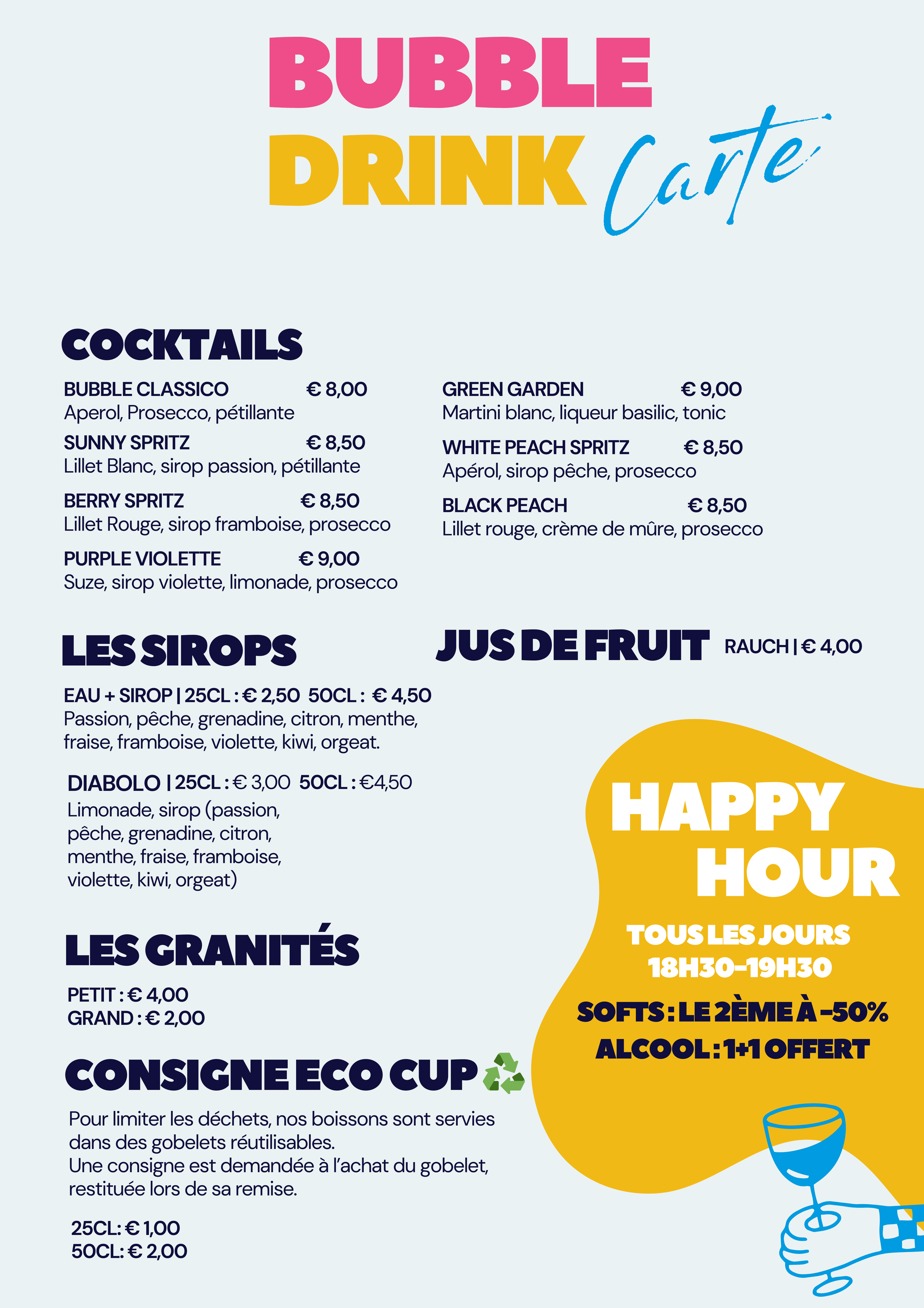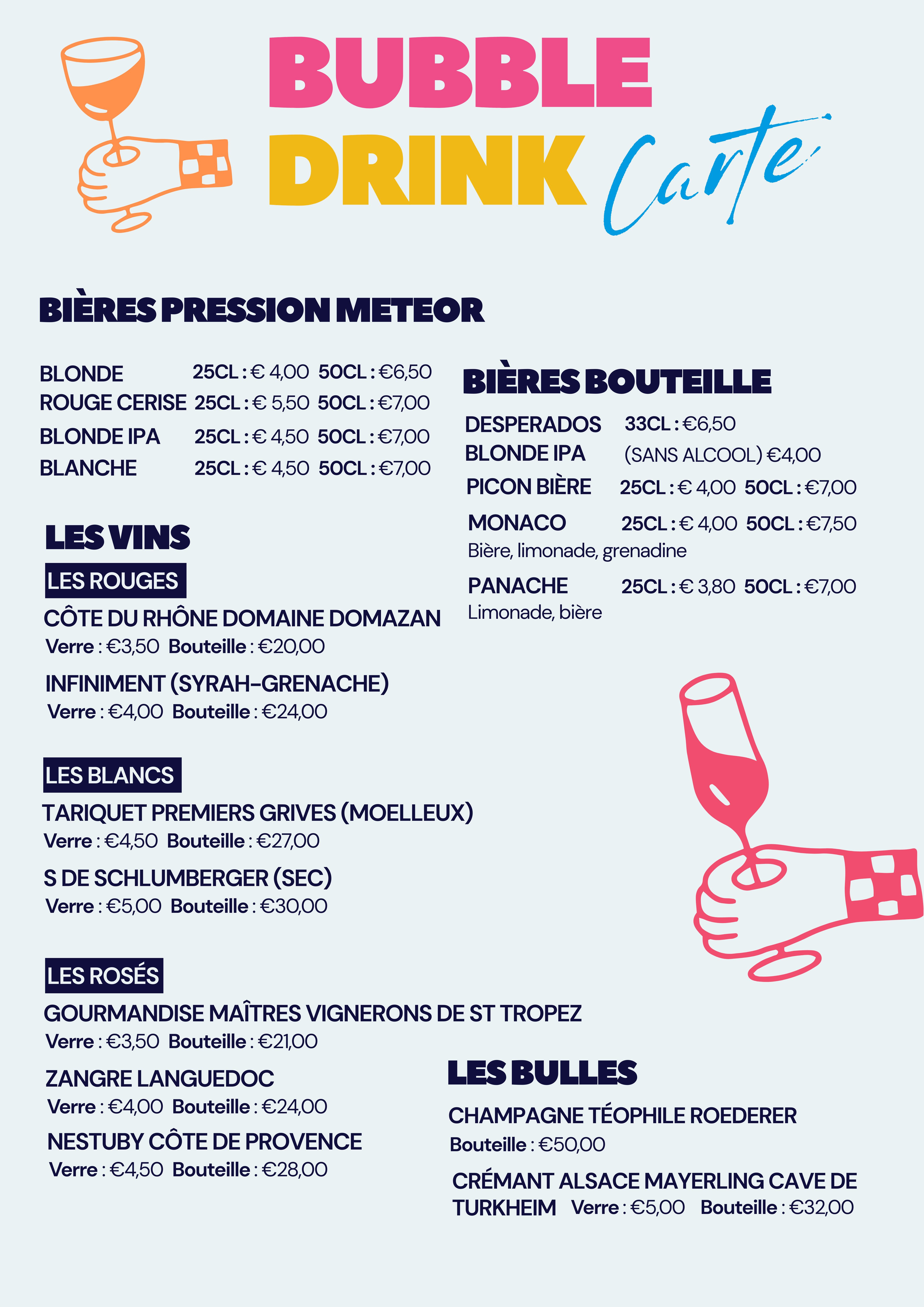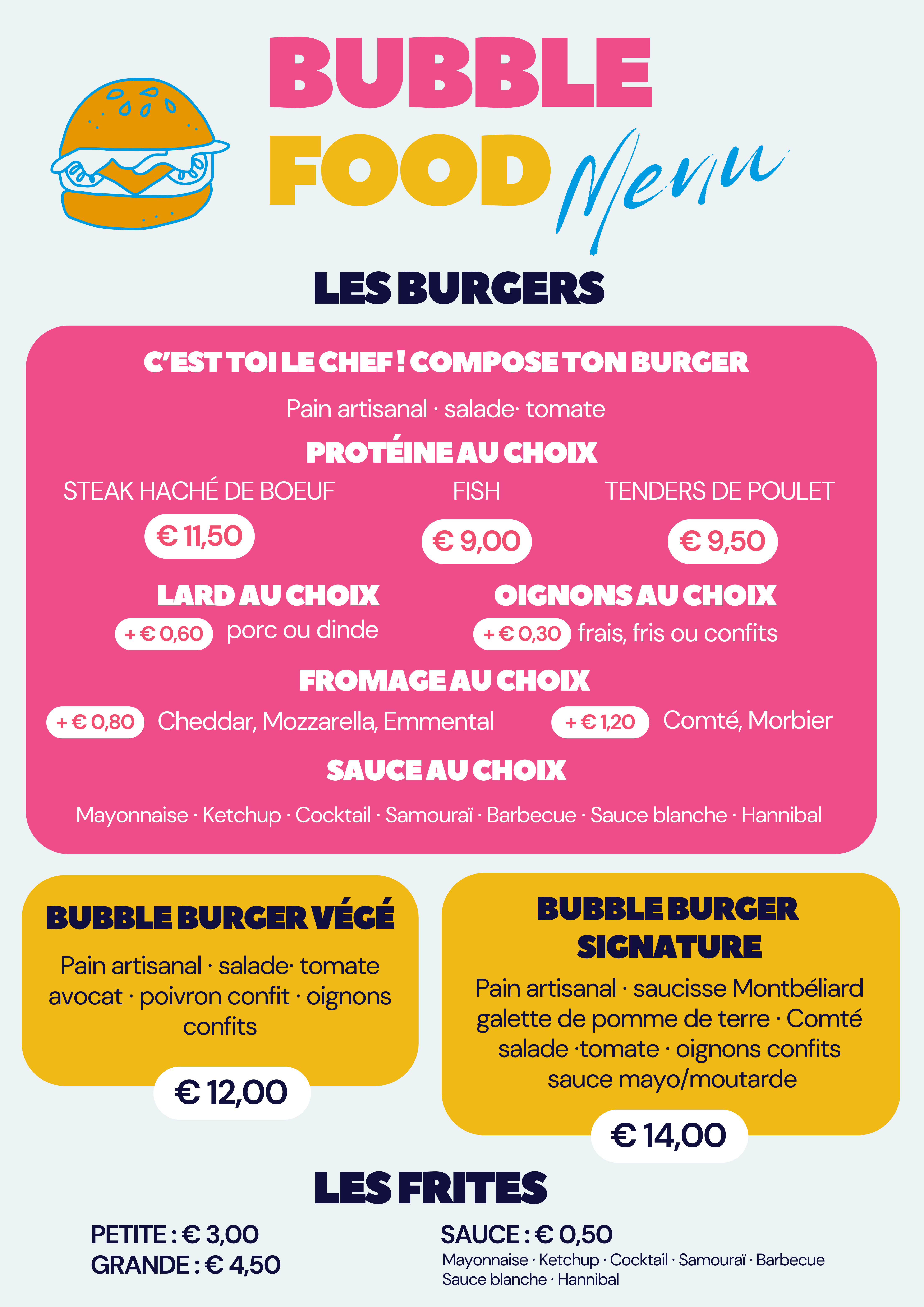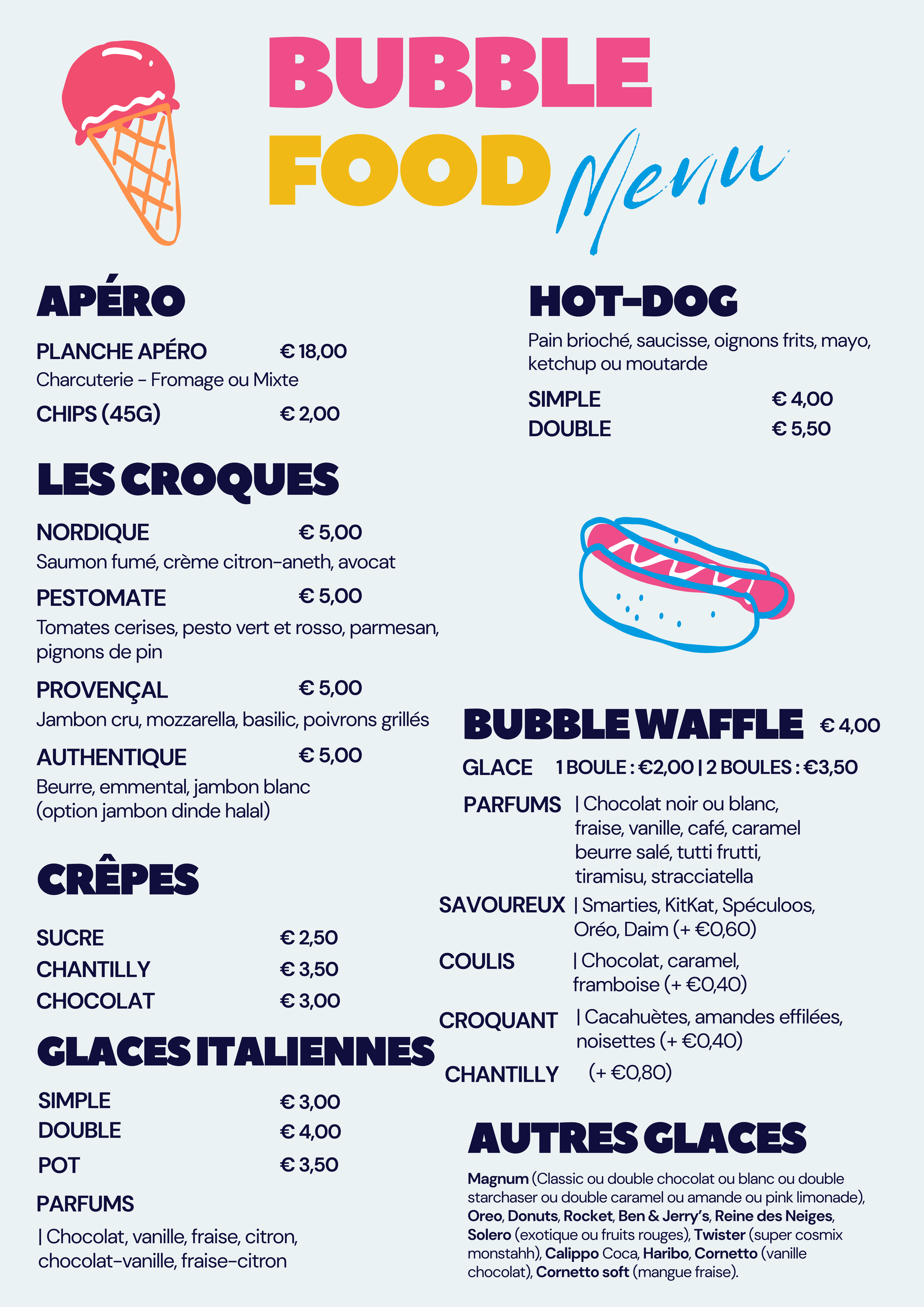 Notre équipe vous propose des hot-dogs, burgers OVNI, burgers de couleur, croque-monsieurs, salades et côté sucré : bubble waffle, granités, spritz de couleur, glaces à l’italienne …
